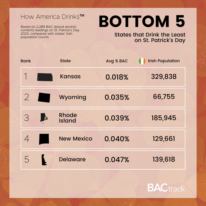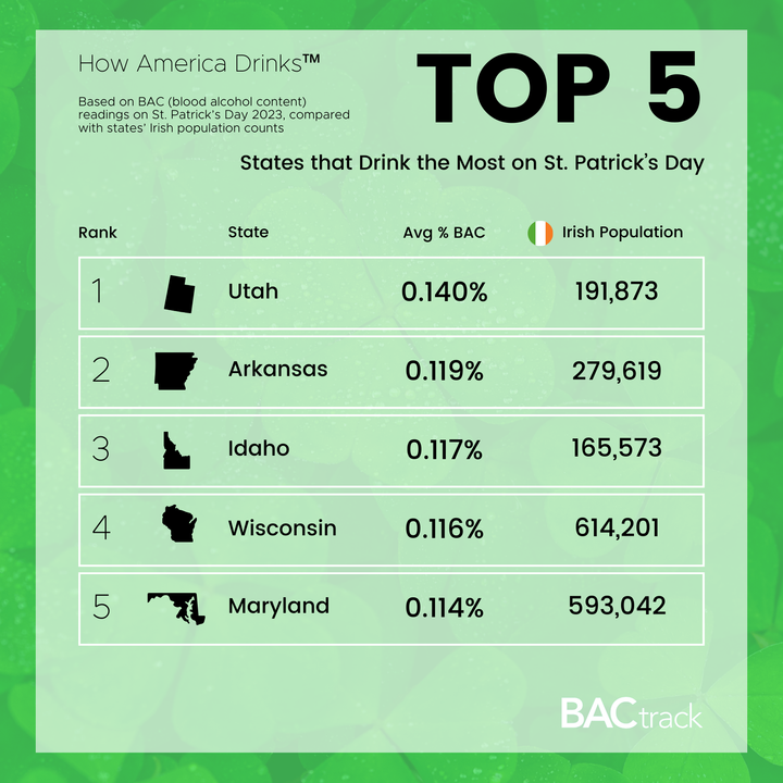 We compared around 3,000 anonymized breathalyzer data points from March 17-18, 2023 with typical turnouts for select, major St. Patrick's Day parades (both spectators and participants) across the country, and the number of residents of Irish descent within each state.