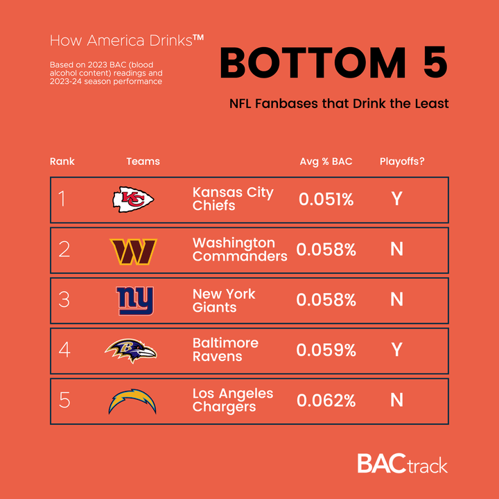 As part of our How America Drinks™ series, the BACtrack analytics team analyzed over 28,000 anonymous BAC results to determine which fanbase drank the most during the 2023-2024 NFL season.